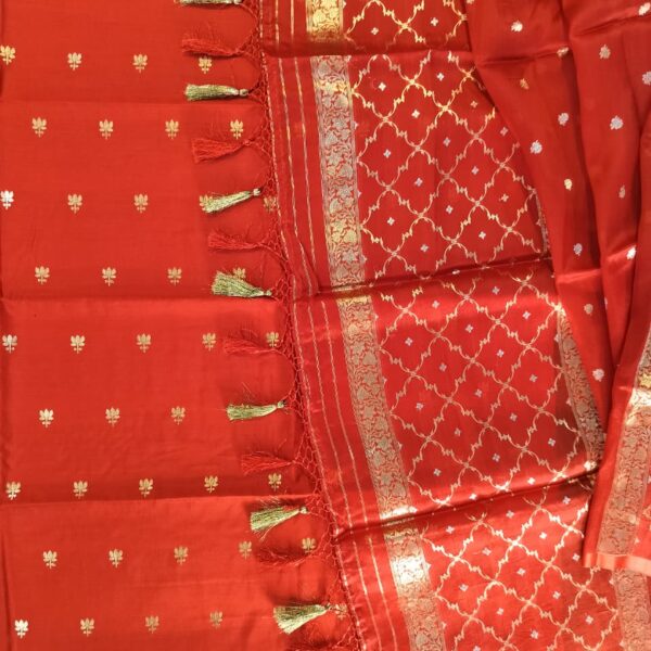 Pure Katan Silk Handloom Vermillion Red kurta and plain lower suit set with Zari Sona Roopa Kadua All over lotus Bootas