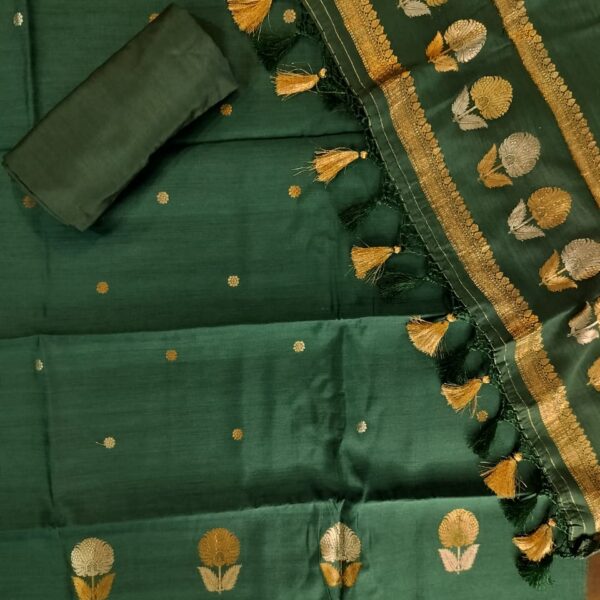 Pure Munga Silk Handloom dark green kurta with Zari Sona Roopa Kadua All over Bootas and plain cotton silk lower.