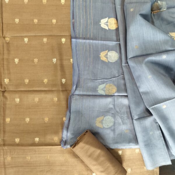 Light brown Pure Katan Silk set with an elegant sandy ink blue munga Silk dupatta