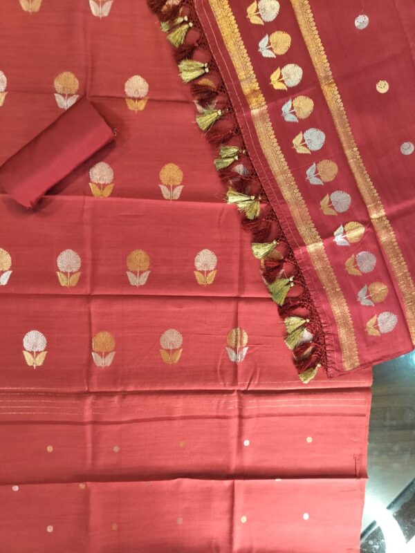 Semi Stitched Pure Munga Silk Handloom Deep Red kurta with Zari Sona Roopa Kadua All over Bootas and plain cotton silk lower.(3 Piece Suit)