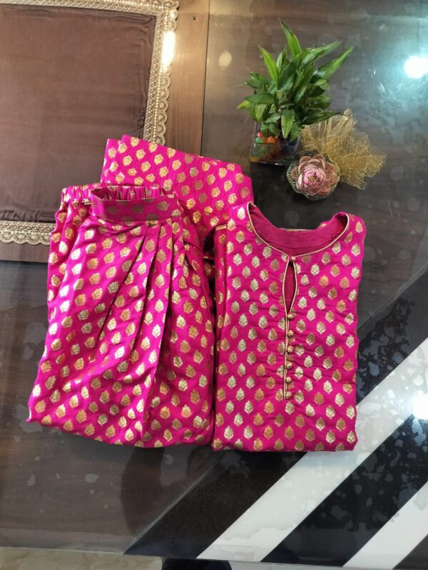 Ready to wear kurta and pallazo coord set in pure Banarasi silk with all over woven zari booties/jaal. Dupatta can be added as per requirement.(3 Piece Suit)