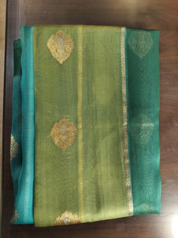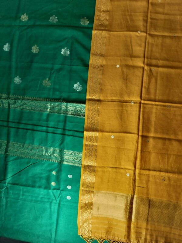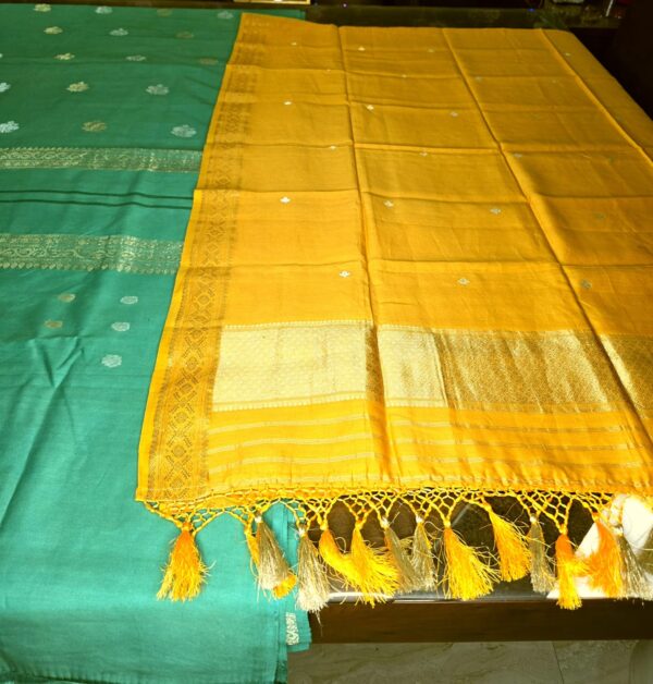 Semi Stitched Pure Silk – Cotton Handloom Suit with Kadua Sona Roopa Zari Bootas and borders Woven all over Kurta and Dupatta. Emerald green kurta and lower, Mustard Yellow Dupatta (3 Piece Suit)