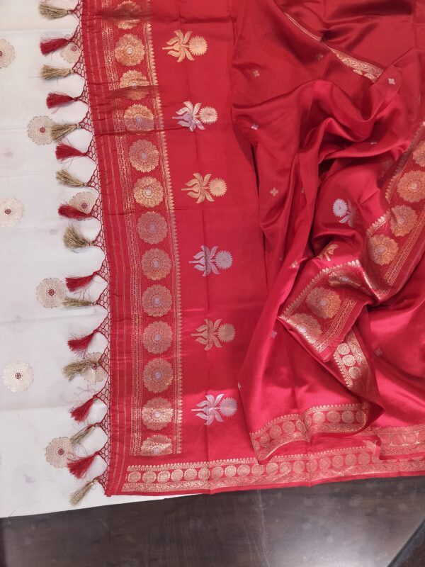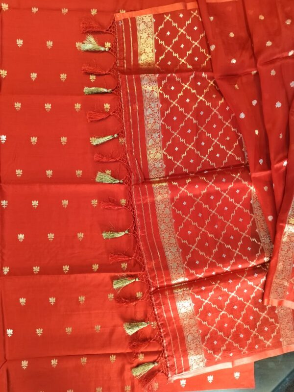 Semi Stitched Pure Katan Silk Handloom Vermillion Red kurta and plain lower suit set with Zari Sona Roopa Kadua All over lotus Bootas.(3 Piece Suit)