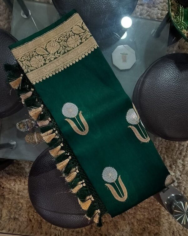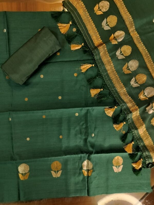Semi Stitched Pure Munga Silk Handloom dark green kurta with Zari Sona Roopa Kadua All over Bootas and plain cotton silk lower.(3 Piece Suit)
