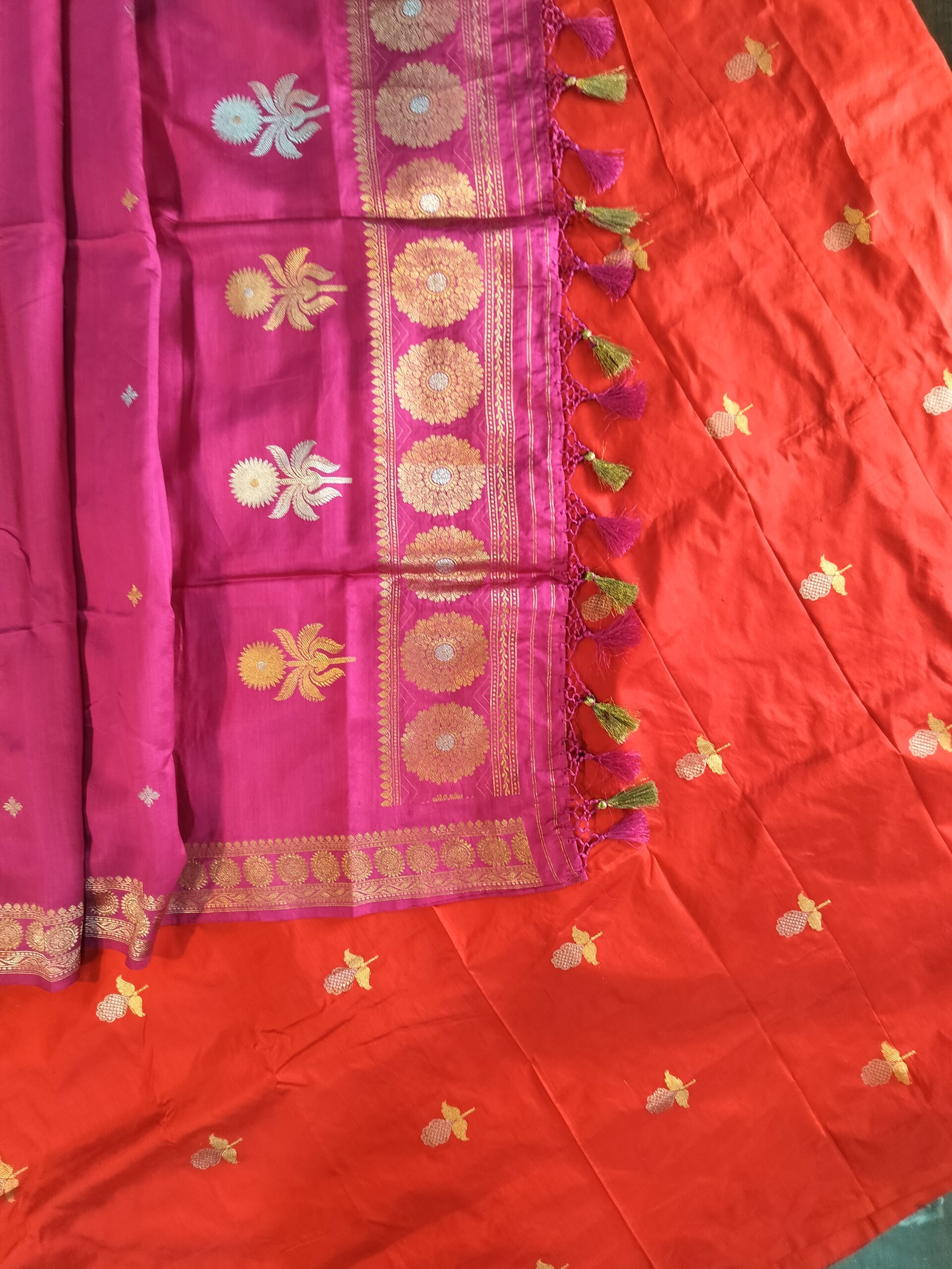 Pure Katan Silk Handloom Deep Red kurta with Zari Sona Roopa Kadua All over Bootas and plain cotton silk lower. Comes with Pure Chiniya Silk Majjenta Dupatta. (3 Piece Suit)
