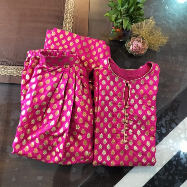 Fuchsia Pink Banarasi Silk Zari Woven All over bootas fabric stitched to perfection into a Farsi Shalwar Suit Set with golden potli button detailing and piping.